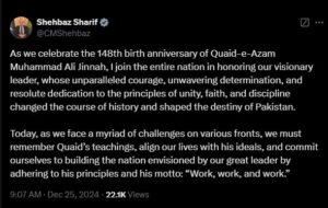 وزیراعظم شہباز شریف نے کہا کہ قائد اعظم نے وہ کر دکھایا جسے لوگ ناممکن سمجھتے تھے، ان کی انتھک محنت کی بدولت پاکستان وجود میں آیا، قائداعظم اتحاد، انصاف اور مساوات پر یقین رکھتے تھے۔ شہباز شریف کا کہنا تھا کہ قائد کی جدوجہد کا سفر محنت اور لگن کے ذریعے خوابوں کی تعبیر کا ثبوت ہے، ہمارا فرض ہے کہ قوم کی ترقی، خوشحالی اور اتحاد کے لیے محنت کریں۔