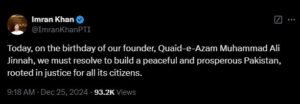 عمران خان نے اپنے پیغام میں کہا کہ آج ہمارے بانی قائداعظم محمد علی جناح کے یوم پیدائش پر ہمیں ایک پرامن اور خوشحال پاکستان بنانے کا عزم کرنا چاہیے جس کی جڑیں اس کے تمام شہریوں کے لیے انصاف پر مبنی ہوں۔