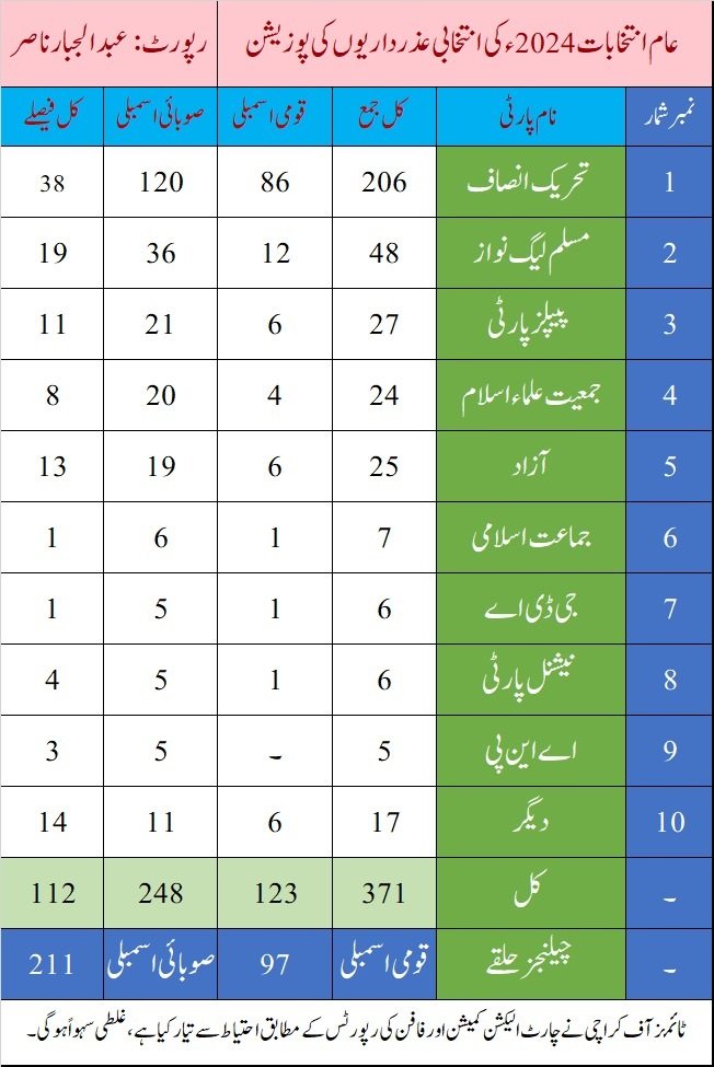 مجموعی طور پر 23 انتخابی ٹربیونلز کے فیصلوں کا جائزہ لیں تو بلوچستان کے 3 انتخابی ٹربیونلز نے 51 میں سے 41 ، پنجاب کے 9 انتخابی ٹربیونلز نے 192 میں سے 45، سندھ کے 5 انتخابی ٹربیونلز نے 83 میں سے 17 اور خیبرپختونخوا کے 6 ٹربیونلز نے 42 میں سے 9 انتخابی عذرداریوں کے فیصلے ہوچکے ہیں۔