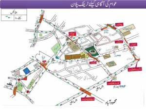 ٹریفک پلان کے مطابق گاڑیاں مختص پارکنگ مقامات پر ہی پارک کی جائیں گی۔ ٹریفک پولیس کی جانب سے جاری بیان میں کہا گیا ہے کہ عوام سے گذارش ہے کہ وہ قانون نافذ کرنے والے اداروں اور ٹریفک پولیس سے تعاون کریں اور کسی بھی پریشانی کی صورت میں رہنمائی کےلیے ٹریفک پولیس 1915 پر رابطہ کریں۔