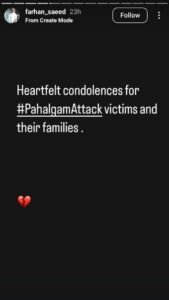 گلوکار و اداکار فرحان سعید نے بھی پہلگام واقعے پر شدید اظہار افسوس کیا، واقعے میں انسانی جانوں کے ضیا پر بھی اظہار افسردگی کرتے ہوئے انہوں نے ہلاک افراد کے اہل خانہ سے بھی تعزیت کی۔