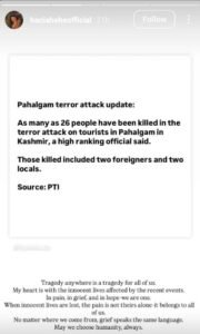 اسی طرح ہانیہ عامر نے بھی انسٹاگرام اسٹوری میں واقعے پر اظہار افسوس کیا اور ہلاک ہوانے والوں کے اہل خانہ سے اظہار تعزیت بھی کیا۔ اداکارہ نے اسٹوری میں بھارتی میڈیا کی خبر بھی شیئر کی، جس میں بتایا گیا تھا کہ حملے میں 26 افراد ہلاک ہوئے۔