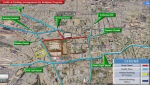 ٹریفک پولیس کی جانب سے جاری کردہ پلان کے مطابق ڈاکٹرذاکر نائیک کے عوامی اجتماع سے تقریب کا آغاز شام 7 بجے ہوگا۔ تقریب میں آنے والے شرکاء کیلئے 2 مقامات پر پارکنگ کے انتظامات کئے گئے ہیں۔ ٹریفک پولیس کے ترجمان نے بتایا کہ وائی ایم سی اے گراؤنڈ اور ڈی جے کالج کے گراؤنڈ میں پارکنگ کا انتظام کیا گیا ہے، شرکا پارکنگ گراؤنڈ میں گاڑی کھڑی کر کے پیدل پولو گراؤنڈ پہنچیں گے۔
